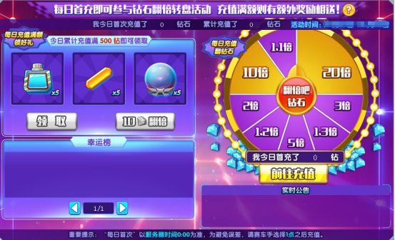 每日首次充值开启钻石翻倍转盘活动!将充值获得的钻石翻倍!