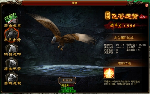 战鹰共5种,玩家佩戴战鹰会获得永久属性加成。每个战鹰都有专属于自己的独特技能。