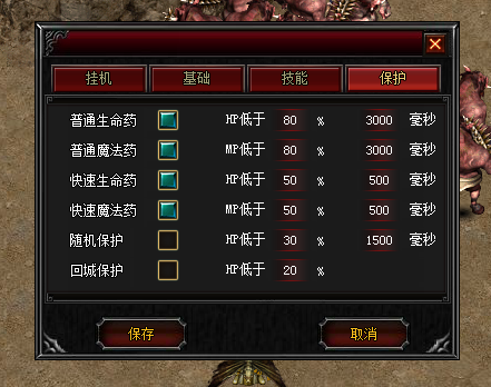 没时间玩,但是又想获得经验,挂机吧,又怕被玩家杀。现在我们有保护系统,您可以随意设置各类保护选项,快要被杀死时,可以马上自我保护并安全回城。