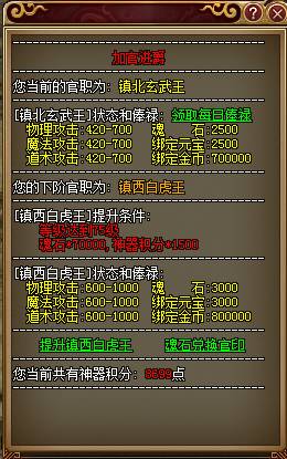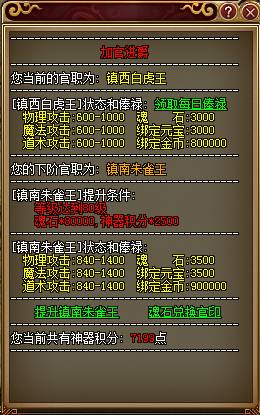 点击“沙漠土城”“官职使者”,查看官职系统,官职系统分为:16个等级 终极等级便是四王称号官职
