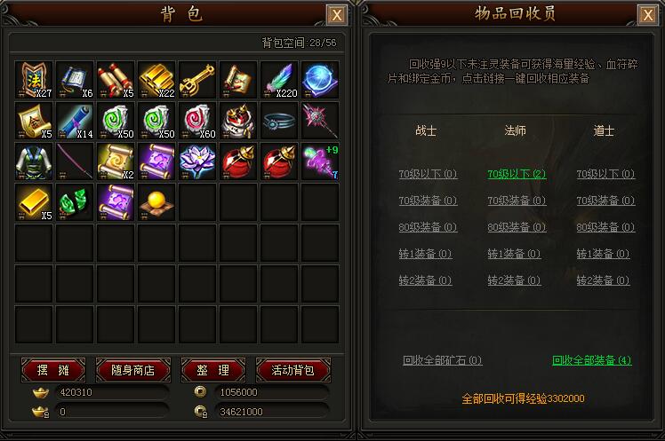 玩家可在比奇城安全区物品回收员出,打开物品回收界面。