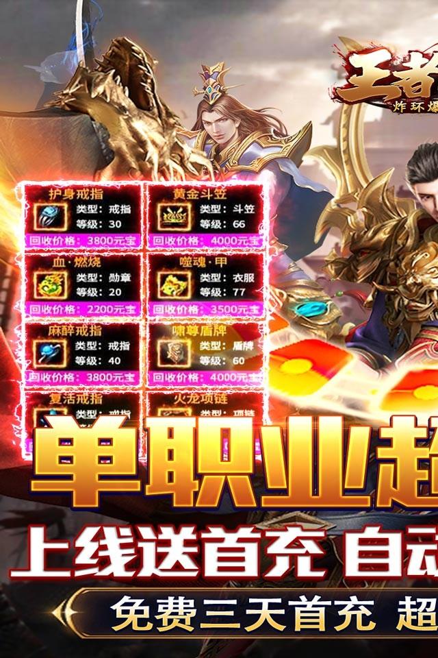 王者战神免费三天首充卡,88W元宝,时装.真龙神甲,暴力打金特权卡,魂环结晶。
