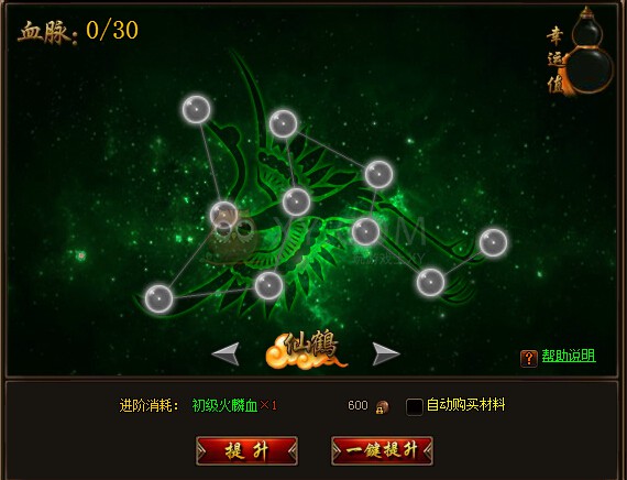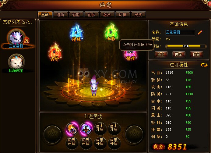 3.仙宠血脉:血脉可以通过用不同等级的火麟血来提升,共有十幅神兽图案,每个图案有十颗星,血脉每升一级按固定百分比增加灵宠的战斗属性,血脉提升后属性值会自动补全。血脉每次提升失败不会掉级,会增加幸运值,幸运值到100时。下一次提升必定成功。