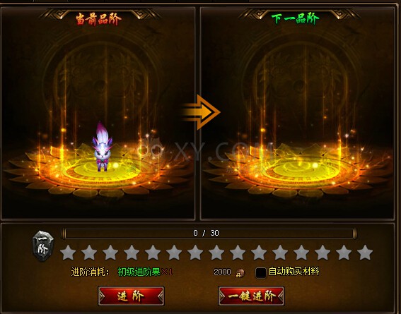 1.宠物进阶:我们可以看到一个品阶有15个星,必须点满才能进阶到下一品质,而每颗星都是有进度条的,越高级的需要越多。进阶可以大大提升宠物属性,宠物达到15、30、45、60阶时,外形将发生变化。不同阶段需要的进阶物品也不同,例如0-14级时初级进阶果,15-29是中级进阶果,30-44是高级进阶果。