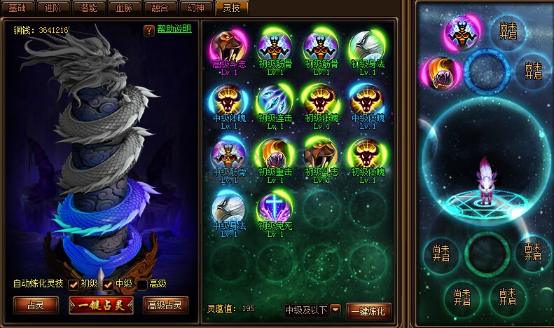 6.仙宠灵技:每天有三次免费机会可刷占灵,免费机会用完后,一次消耗1万铜钱,有多重灵技可以选择,灵技的品质分为四种,根据盘龙柱不同层次的占灵可以获得不同品质灵技,占到的灵技如果是等级低或者用不上的,可以直接炼化增加灵蕴值,灵蕴值可用来提升灵技等级。