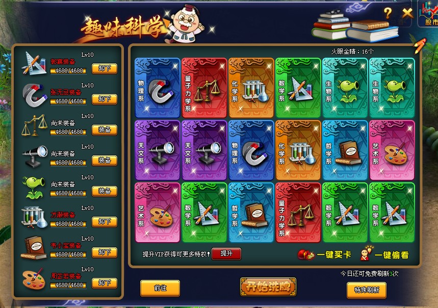 标识,即可开启科学界面。科学系统内含八类科学,每类科学对应不同的强化属性和光效。