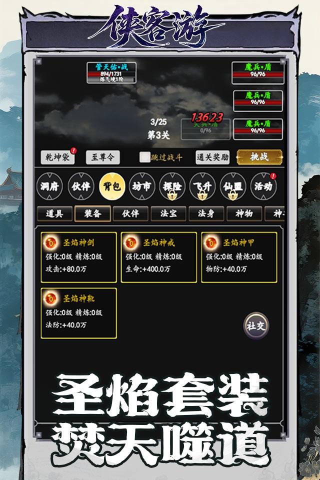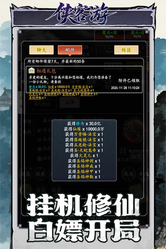 《侠客游(圣焰飞升0.05折免费版)》是一款文字类挂机游戏——上线即巅峰,挂机躺赢修仙界!​文字挂机自动修炼,资源多到系统倒贴钱!你的肝已放假,修为在ICU狂飙!​​ 道友,还在肝?本座挂机三天,已经渡劫成仙了!