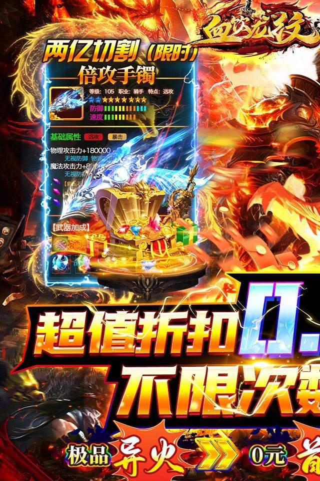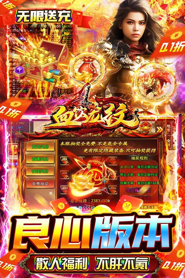 充值0.1折,游戏内所有充值0.1折,不限次数不限额度!《血饮龙纹》是一款高福利版本的无限刀传奇手游,游戏内每天都可以领取红包,爆率全面提升,群切秒怪效率飙升,体验极致攻速刀刀切割的快感。游戏操作简单易上手,无限激情,无限热血,全新战场,巅峰对决,重温兄弟情谊,成就传奇人生。