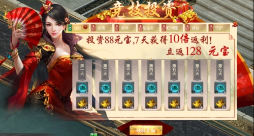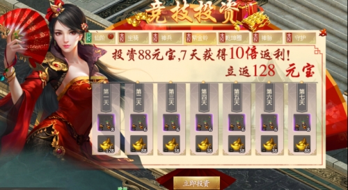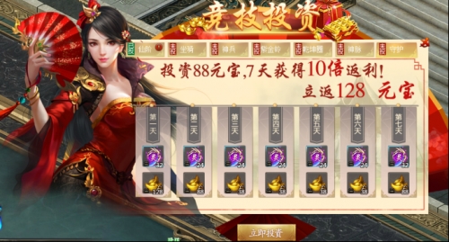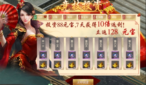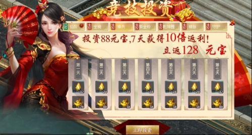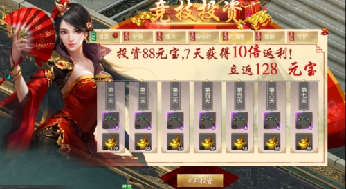 3、每项投资均花费88元宝,7天获得10倍返利!立返128元宝!