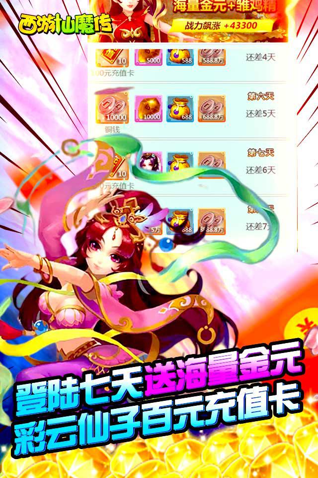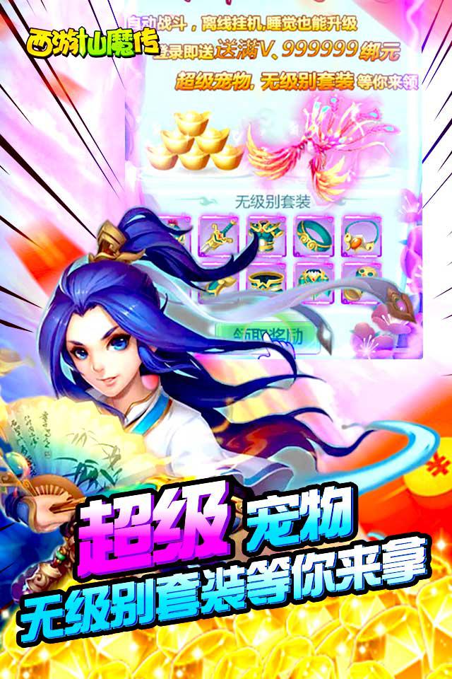 《西游仙魔传(百万福利)H5》是一款回合挂机类游戏,上线即可获得满级VIP,999999绑元!无级别套装,轻松挂机,睡觉也能升级,更有无级别套装,超级宠物等你来拿,修仙之旅磨难重重,登录七天可领百元充值卡,彩云仙子助你提升战力,勇闯西游世界!!