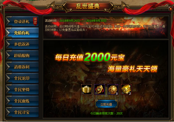 2、活动说明:活动期间每充值2000元宝可领取返利奖励,单日一共可领取20次,每日0点重置。请及时领取,以免充值后奖励丢失。