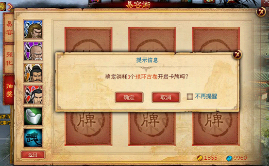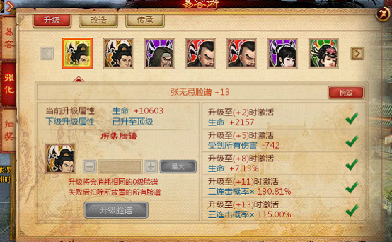 玩家可以选择指定数量的脸谱进行升级,每个脸谱会增加成功率百分比,脸谱数量不同,成功率也不同,如失败将扣除所放置的所有脸谱;