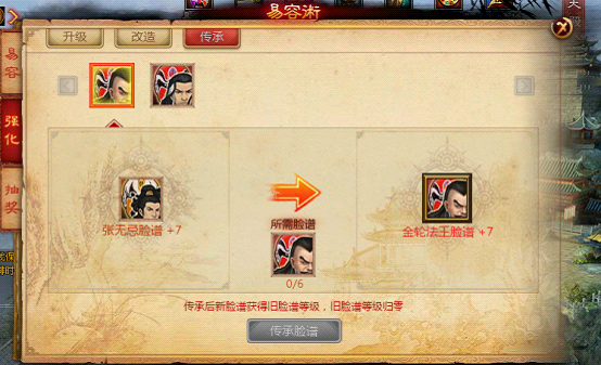 所传承的脸谱必须为+0才可以进行传承,随着强化等级的高低所消耗的主品质脸谱数量不同;