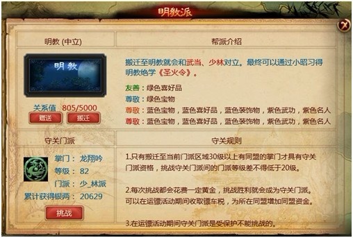 在世界地图四大门派势力的位置上各有一个“守关人”, 当掌门达到30级,选过门派势力并且拥有同盟,便可参加竞争成为本门派势力的“守关人”。晚上24点至早上8点及运镖期间不能挑战,其他时间均可为成为“守关人”而发起挑战。