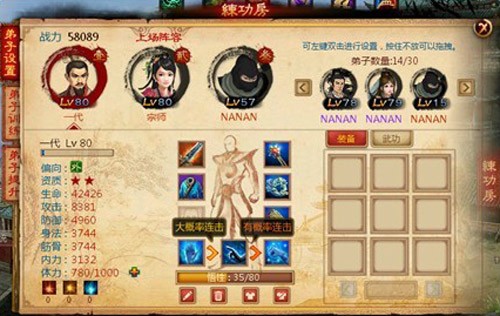 掌门及门下弟子都会出现在这个界面里,可以设置战斗中的上场阵容及出战的顺序,为掌门或是弟子穿戴装备和携带武功。门派的强弱与战斗力,不仅是依靠掌 门人而已,更多的是需要众多门派弟子,所以提升弟子的各项属性能力与资质可是必不可少的哦!下面让我们来逐步了解该建筑的各项功能。
