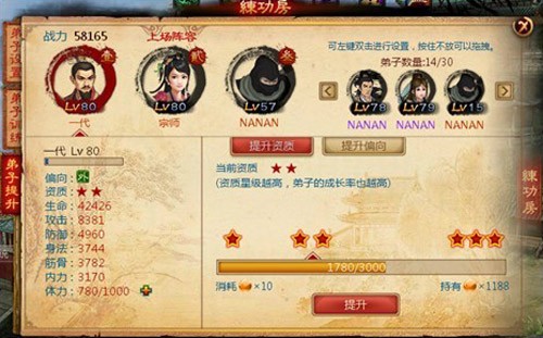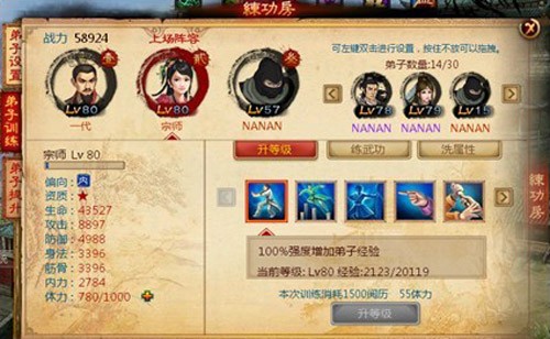 3) 升级弟子等级强度100%-300%为阅历、体力消耗、400%-600%为黄金消耗。