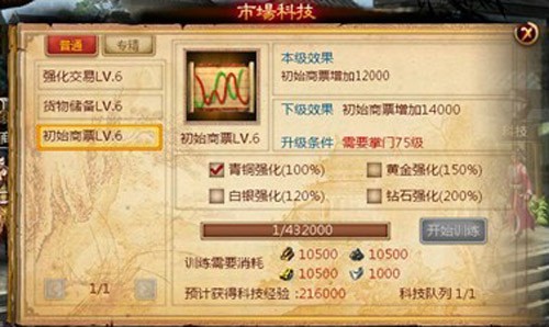 3)科技:可供玩家升级每日初始商票、额外回复通商令、仓库上限以及各类商品出售收益增加。