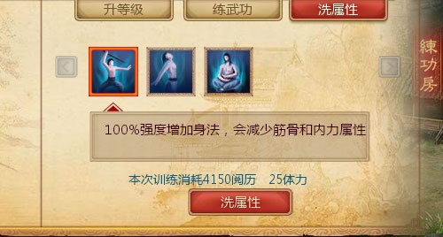 弟子50级时,练功房内将开放“洗属性”功能。玩家可以消耗阅历和弟子体力值,来调整弟子的(身法、筋骨、内力)3者的属性分布。