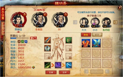 掌门及门下弟子都会出现在这个界面里,可以设置战斗中的上场阵容及出战的顺序,为掌门或是弟子穿戴装备和携带武功。而每个弟子精通的武功类型都有所不同,给不同弟子装备不同的武功出来的效果也就完全不一样。