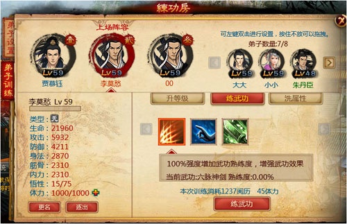 练功房-弟子训练,可以安排弟子的升等级、练武功、洗属性,加强弟子的基础能力,要注意的是弟子的等级不能超过掌门自身的等级。