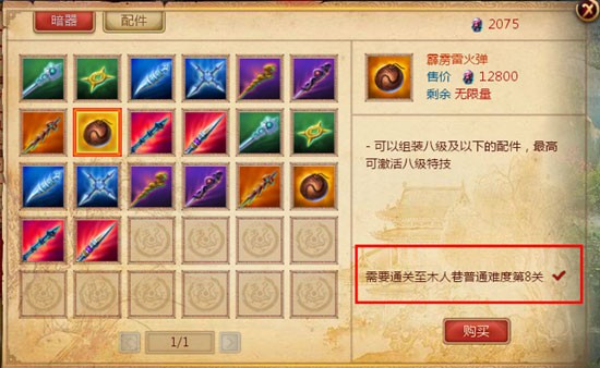 8) 霹雳雷火弹(八级品级):通关木人巷第八关才可进行购买(黄金购买只需打通第七关即可购买);