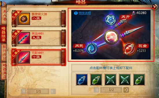 2) 每个暗器最多可以开启3个配件插槽,插槽必须按照顺序开启;