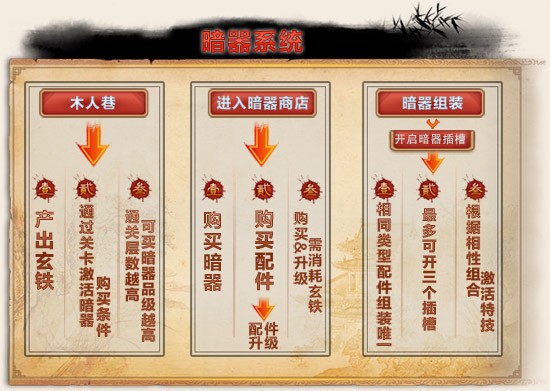 3) 木人巷产出的资源(玄铁)来提升暗器系统的暗器配件;