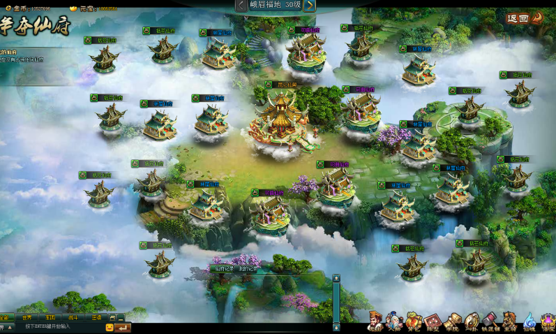 仙府根据不同等级共分成4块(30、50、70、90)级,每块场景的仙府根据颜色来品质高地【(绿、蓝、紫、橙)低到高】,品质越高收获的奖励也相应的越好。玩家可以根据自身的等级和战力来选择。