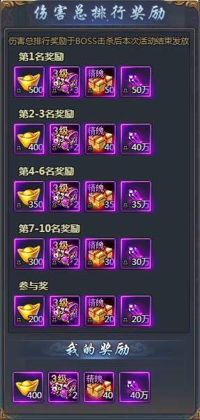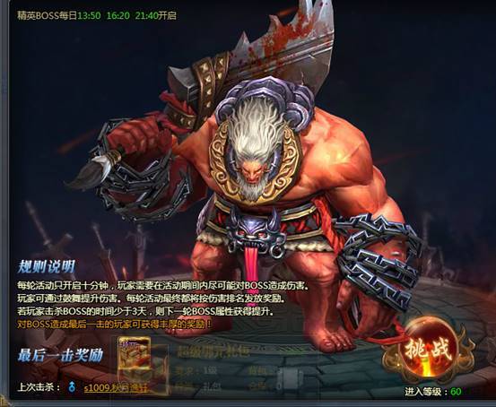 每日下午一点五十,四点二十,九点四十开启精英BOSS,伤害排名上榜有丰厚奖励,BOSS如果在当前开启时间段内没有被击杀将会在下个时间段以剩余血量继续出现。