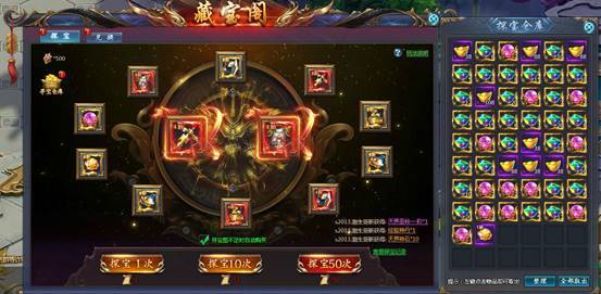 藏宝阁有概率产出各部位的天界装备,以及大量的天界神石,除此之外还有经验神丹、绑定元宝等海量道具。