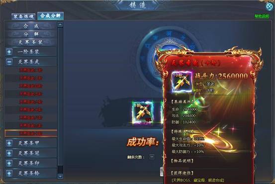 天界神石可以通过游戏内“锻造-合成分解”合成各部位的天界装备