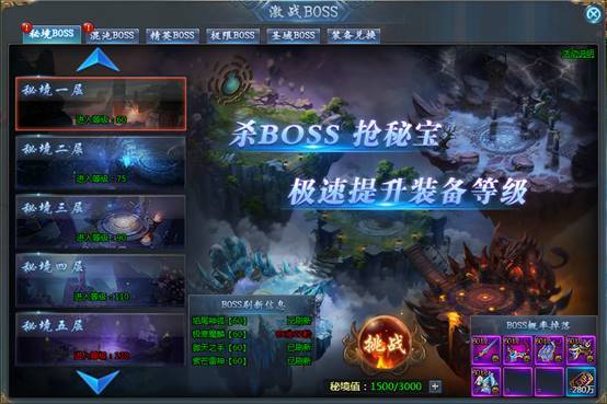 装备升级卷轴在秘境BOSS里掉落,伤害排名最高可以获得两个装备宝箱哦!