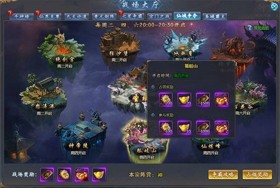 仙域争霸是本服内以宗门为单位的PVP领地争夺活动,主要产出荣誉值,宗门贡献以及随机进阶丹礼包。