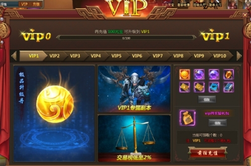 ”图标按钮进入系统,“VIP等级”通过充值提升,升到对应的VIP等级可手动领取VIP等级奖励,每周有周礼包可领取,每周的周一凌晨会重置周礼包领取条件。