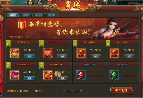”图标按钮进入系统,商城分为“每周特惠、常用道具、成长变强、绑元专区”四个系统模块,通过消耗“元宝、绑元”不同的货币可购买到商城中的各种材料道具。
