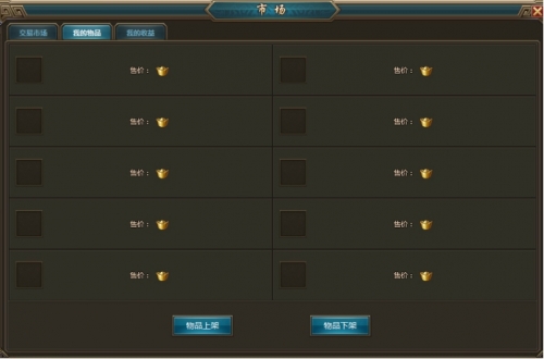 ”交易市场按钮可打开市场界面,玩家可通过市场与其他玩家进行游戏内非绑定物品的交易。交易成功后,会扣除卖方部分的所得元宝作为交易税。