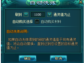 4、在界面中,你可以清晰的看到当前所选择的宠物的通灵值及给人物角色附件的各项属性值,右侧则会显示洗炼后这些数值的相应变化。点击界面左侧的“自动洗炼”按钮,在弹出的对话框中设定你想要达到的最终通灵值数值,勾选自动购买材料选项,之后点击确定按钮,系统就会自动帮你操作,完成洗炼和替换的过程,直到获得你设定的通灵值为止。