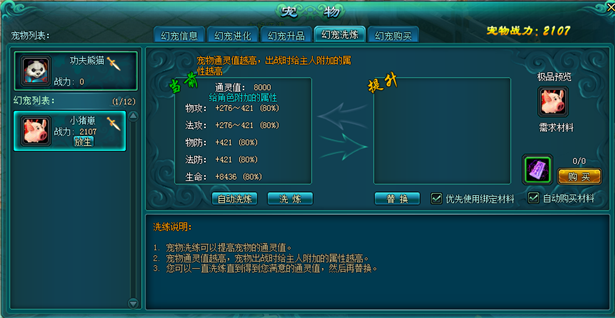 你的战宠和幻宠还具有自己的通灵值,通灵值越高,能给主人附加的属性也就越高。你可以通过洗炼操作来提升宝宝的通灵值。洗炼通灵值主要分为自动洗炼和洗炼两种方式。通过“自动洗炼”的方式来操作,如果洗炼出来的通灵值高于之前的通灵值,系统将会自动为你的宝宝替换上去,直到到达你所设定的目标通灵值为止。而通过“洗炼”的方式来操作,你可以根据实际情况来进行洗炼,得到自己满意的通灵值,然后再决定是否要进行替换。