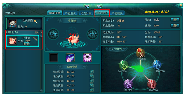 2、在界面左侧选择要进化的宠物,之后点击界面上方的“宠物洗炼”或“幻宠洗炼”按钮,打开洗炼页面。