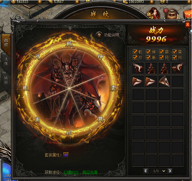 战纹分为九尾、血翼、魔尊、地心、百鬼五个等级,每个等级按八卦分为乾、坤、震、巽、坎、离、艮、兑八个部位碎片,只有集齐每个等级的八个部位碎片,才会激活相应的战纹套装属性。
