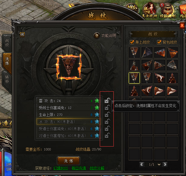 洗练时需要消耗战纹结晶,并可以使用锁定功能,保留需要的属性,