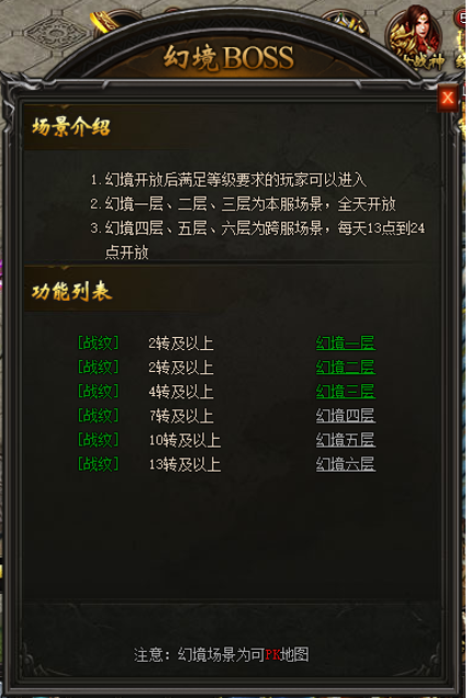 幻境共分为六层,只有达到相应的转数和要求才能进入,幻境为可PK地图,所有进入的玩家需小小谨慎。