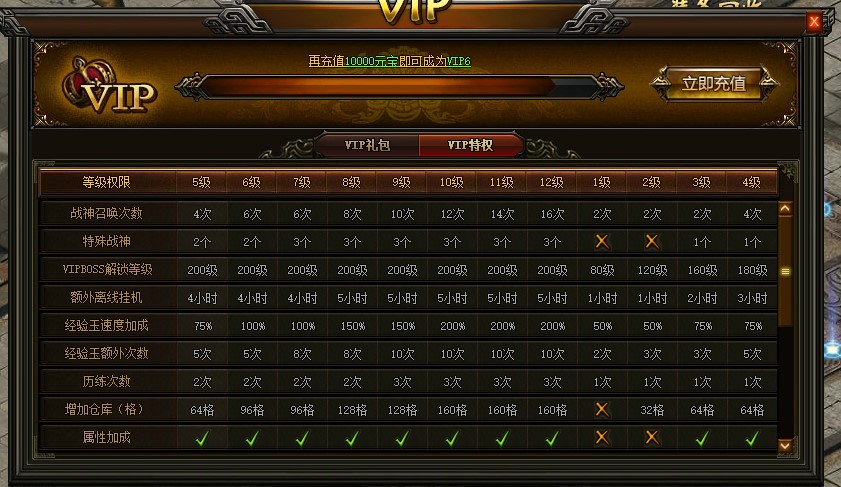 成为VIP可以获得丰厚的道具奖励,更可以获得专属技能,专属战神、专属BOSS、额外离线挂机时间、额外经验玉使用次数等一系列超值特权,打宝升级更容易。VIP等级随着充值金额的增加而不断提高,VIP等级提升不需要任何消耗,VIP等级越高,可以享受的特权越多。