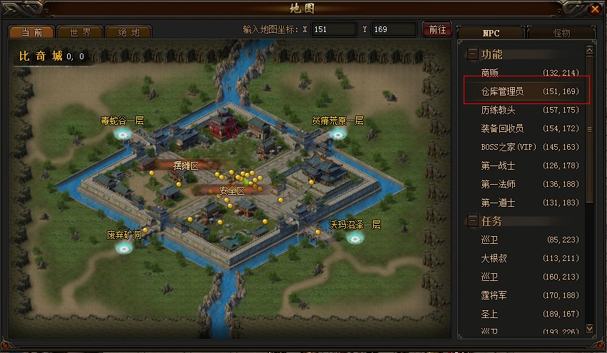 仓库是游戏中必不可少的功能,在《英雄合击》的比奇城中,有一位仓库管理员,专门处理仓库存取业务。