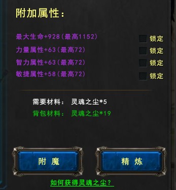 装备附魔需要消耗灵魂之尘,每附魔一次消耗5个灵魂之尘,这一项消耗是唯一的同时消耗也比较小。而附魔中 真正大的消耗在于精炼。精炼一次需要消耗50灵魂之尘,每次随机提升附魔属性中的一种或者两种,因此,想 要获得更好的附魔属性,需要大量的灵魂之尘。但如果是RMB玩家的话,可以使用金币进行精炼,每次40金币。