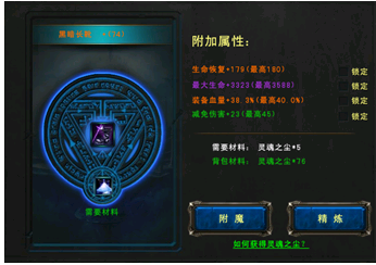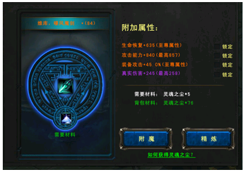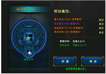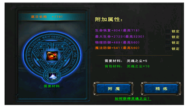 当你身上装备基本都是你需要的属性时,你可以有两个选择:一是锁定属性再碰碰运气。二是使用“精炼”系统,用普通(每次消耗100个尘)或金币去洗,这个模式是肯定能增长属性的,但消耗也比较厉害。这种方法必定能刷出至尊属性(当前武器等级允许的最高值)。