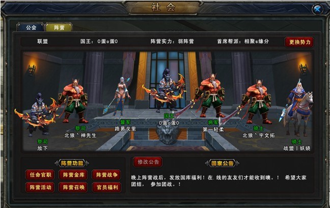 3、阵营福利:阵营国王可以发放国家福利,可选择“发给自己”、“发给官员”、“发给全民”。