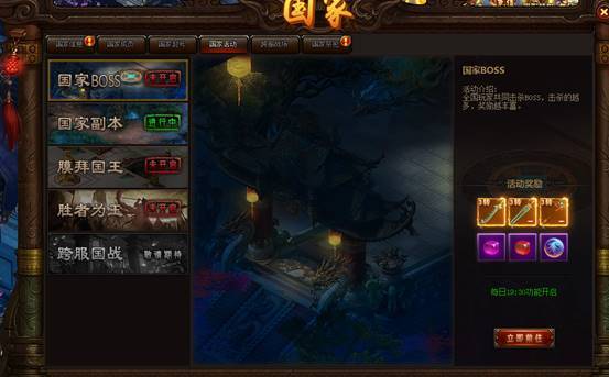 国家BOSS是产出日常战功和国家经验的主要方式,国家BOSS需要全国玩家一起团结协作才能通过,每天只有30分钟,结算时根据击杀BOSS的个数给全民在线玩家发放福利,挑战层数越高,奖励越丰厚。同时每只BOSS都会掉落大量的材料奖励,神器进阶石、高转橙装掉落。