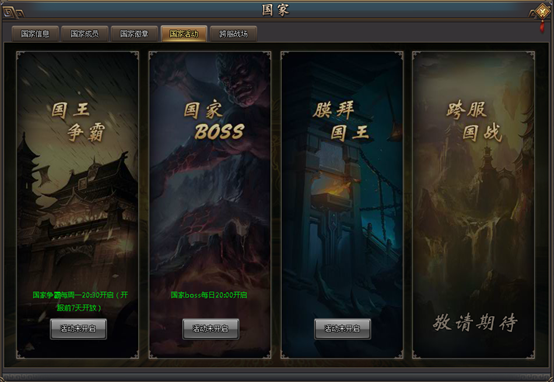 玩家点击国家面板参与对应的国家活动,可以与本国的玩家并肩作战,共同面对解决问题,磨合团队合作能力,为将来的跨服战场增加更多胜算