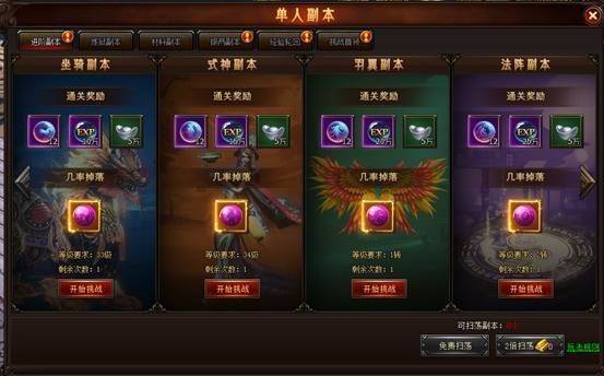 玩家首次挑战后,次日即可进行免费一键扫荡获得奖励,同时也可以在挑战完毕的同时消耗少量的货币获取双倍奖励,人物等级越高开启副本的数量也就越多获得的奖励也就是越多的